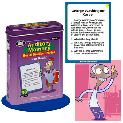 Each card front has a story with three comprehension questions for the student to answer using information they hear in the story. The card back presents a colorful and whimsical illustration of the story.
