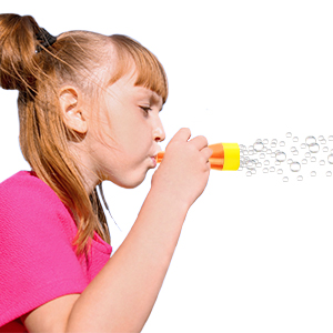 - Blow gently through the other end of the tube and watch as a long, amazing line of bubbles pops out!