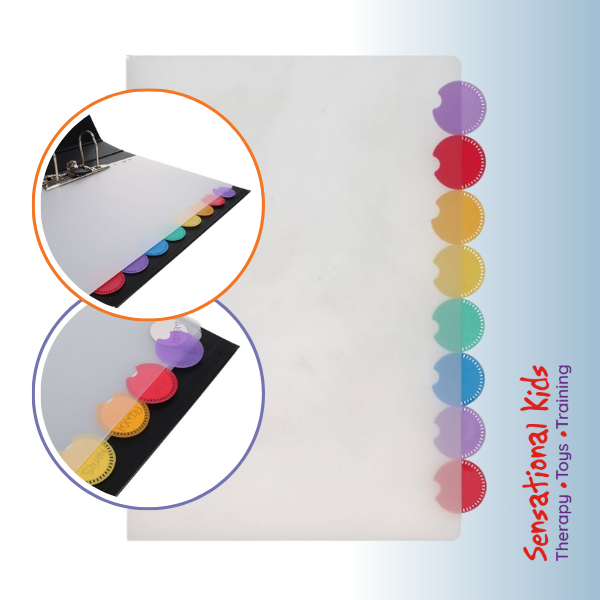 Keep schoolwork, therapy resources, or classroom materials neatly organised with the A4 Round Tab Transparent Subject Dividers – 8 Part.