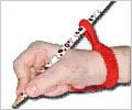 The HandiWriter is worn with the large loop around the wrist. The charm is held in the palm of the hand with the little and ring fingers. The thumb, first and middle fingers grasp a pencil and the top loop of the HandiWriter is placed around the top of the pencil. This pulls the pencil back into the web of the hand, and forms the therapist recommended “TRIPOD GRIP”.